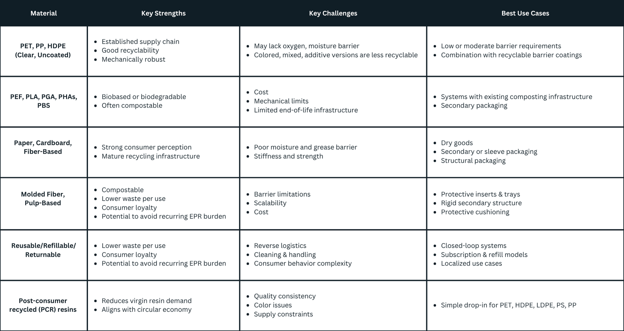 With the tide of EPR rising, the smartest thing companies can do after reducing packaging by volume is to change their packaging materials. Proactively switching to sustainable materials better positions companies for future compliance needs while reducing fees tied to the patchwork of existing EPR laws. When planning for a material shift, leadership needs to consider:
